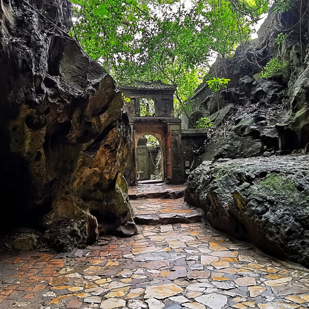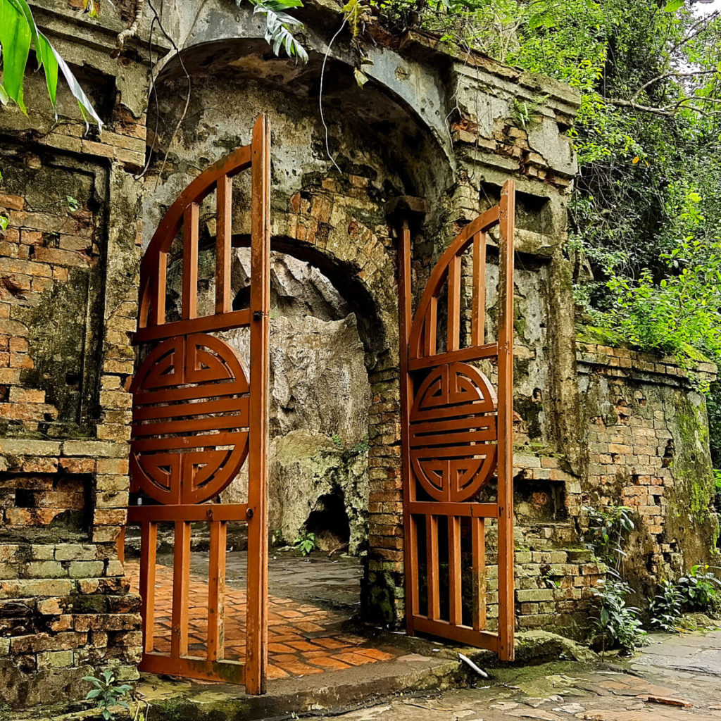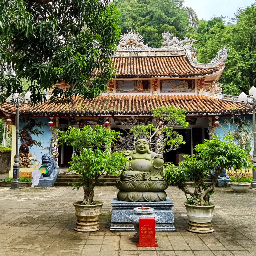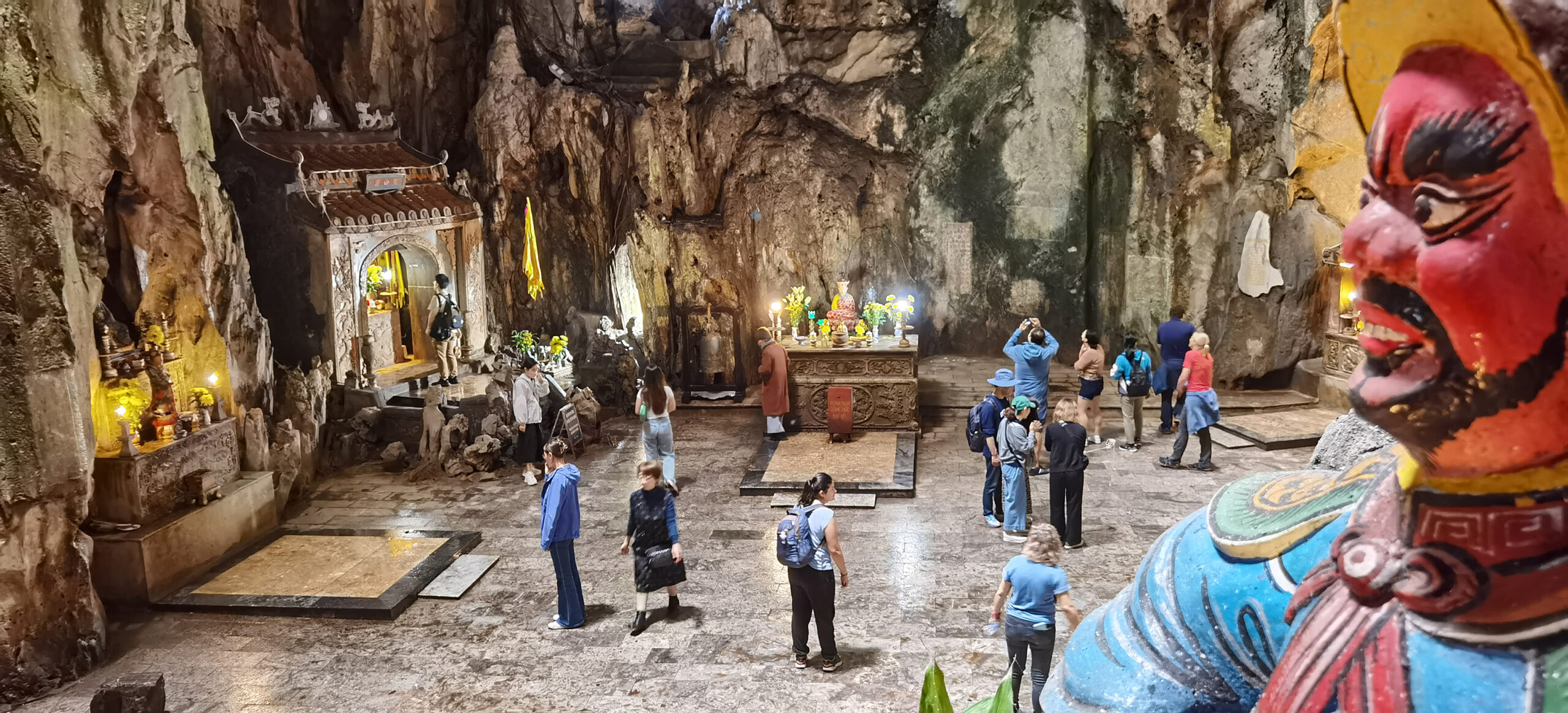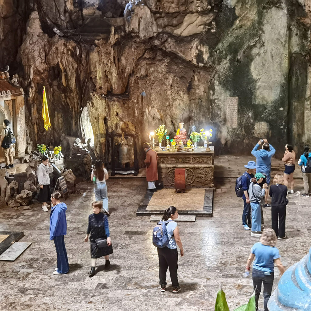Now we are ready to start our tour “Marble Mountains, Am Phu Cave, Monkey Mountains and Explore Hoi An City by Night”. Firstly, we will visit Marble Mountain, also known as Ngu Hanh Son, is the group of five hills, made of limestone and marble. They look like 5 fingers lying close to the sea. There are several caves, caverns, pagodas, many stairs and 2 spectacular viewing points. They are also home to several buddhist sanctuaries and hindu grottoes which are much visited places of worship for the local population. The marble mountain has become one of the must-see destinations for those who enjoy the beauty of nature and want a respite from the busy urban areas.